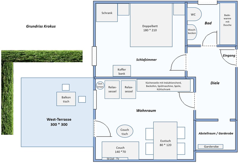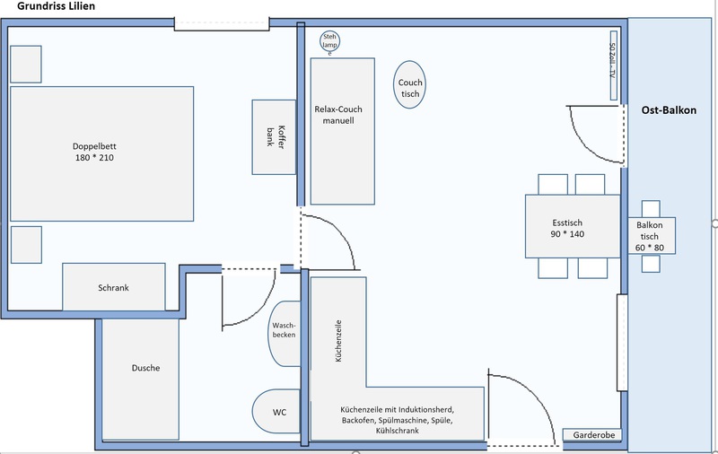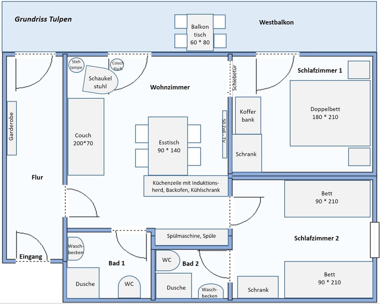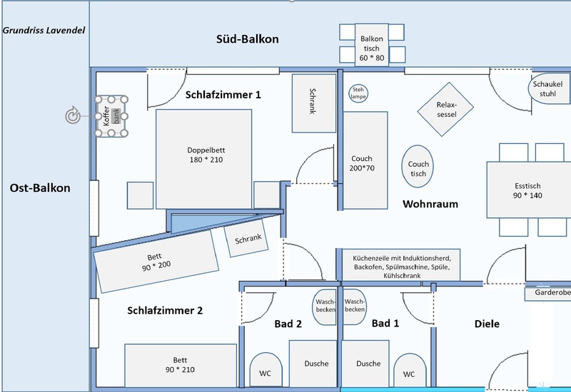 Die Größe der Zimmer variiert je nach baulichen Gegebenheiten. Die Einrichtung mit hellen Möbeln und die Küchenausstattung sind nahezu identisch in allen Ferienwohnungen.